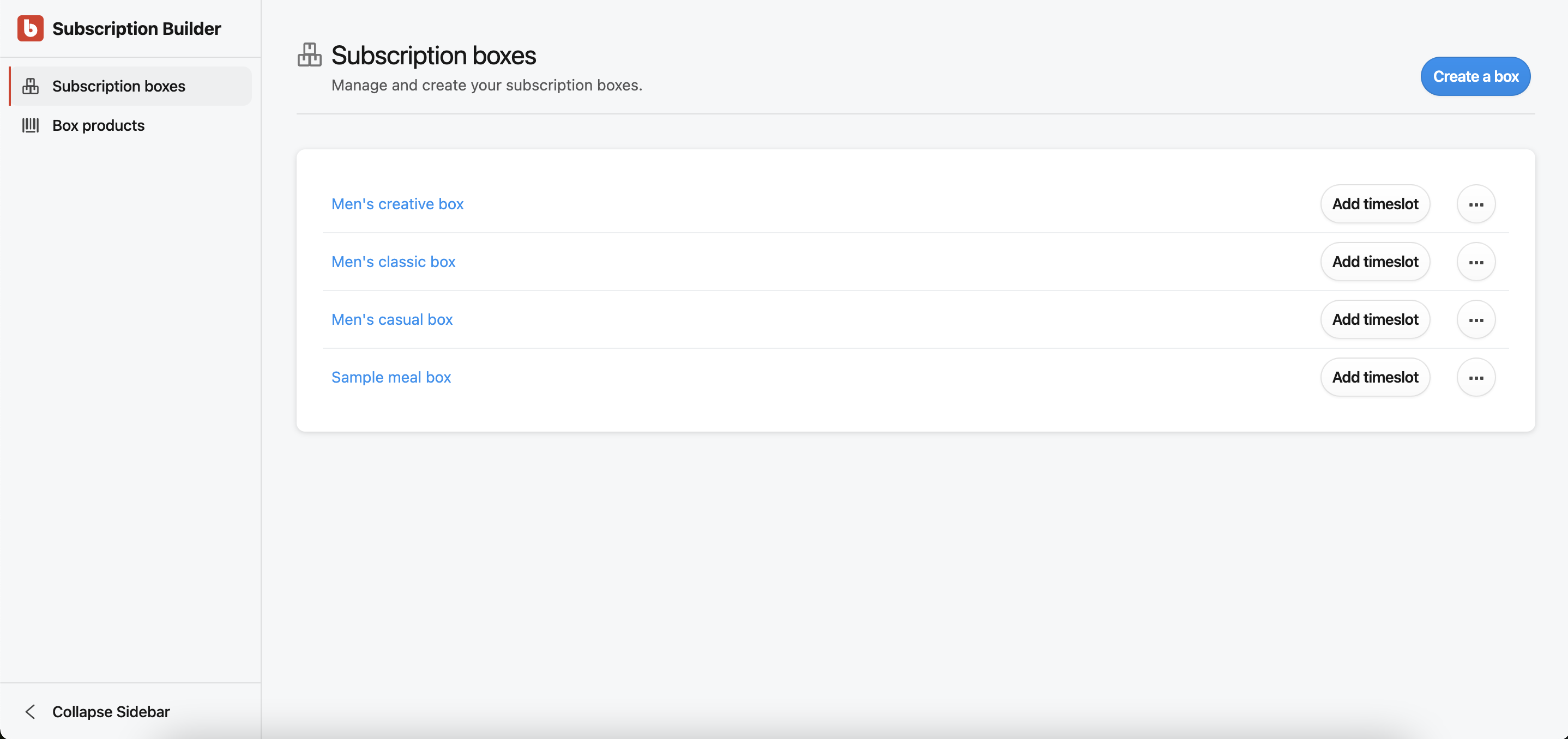 The Subscription Builder Admin UI enables you to set up your store's boxes, box products, time slots, and time slot options. Once these entities have been configured, they will be available for consumption using the Subscription Builder API.